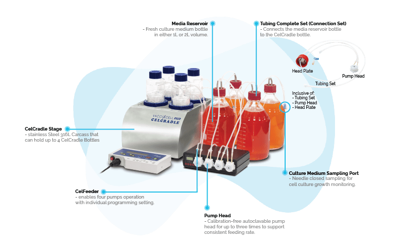 | Recommended CO2 incubator dimension | CelCradle Complete: CCL-170L model: 505 x 535 x 633 mm(19.9" x 21.1" x 24.9") and CelCradle Continuous SYstem Complete: CCL-240L model: 595 x 640 x 633 mm (23.4" x 25.2" x 24.9") |