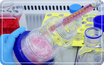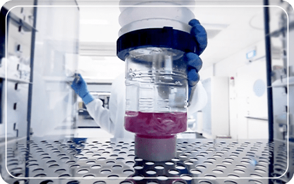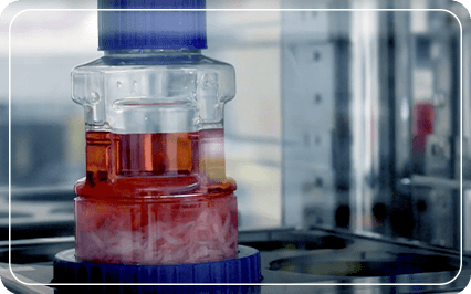 CelCradle 中的「潮汐運動」原理:瓶中的載體和培養基。當波紋管向上推時,附著在載體上的細胞將浸潤於培養基中,而細胞則吸收營養。當波紋管被釋放時,細胞暴露在環境中的空氣中進行通氣。